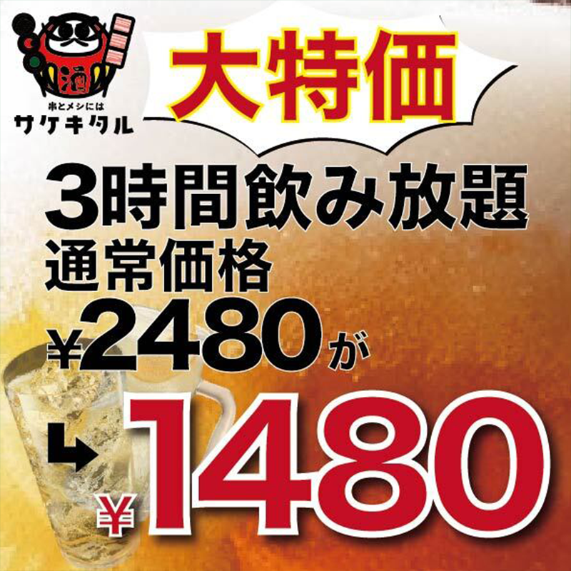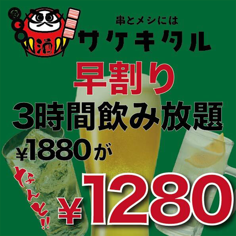 3時間単品飲み放題 1,880円 ⇒ 1,280円